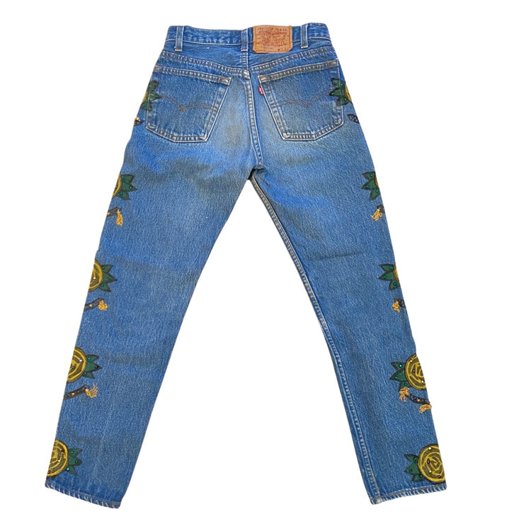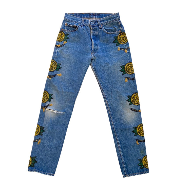Yellow rose hand painted Levis 501 jeans with the world's finest crystals and gold chain tassels.